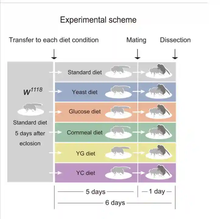 以标准饮食饲养野生型苍蝇,从鸡蛋到年轻人。在封闭后5天收集的年轻雌性被转移到装有标准饮食和五种替代饮食的小瓶中。转移五天后,其中一些苍蝇被允许与雄配1天,其他雌性苍蝇在没有雄性的情况下连续饲养1天。