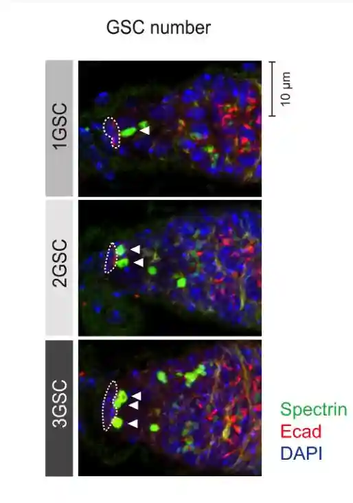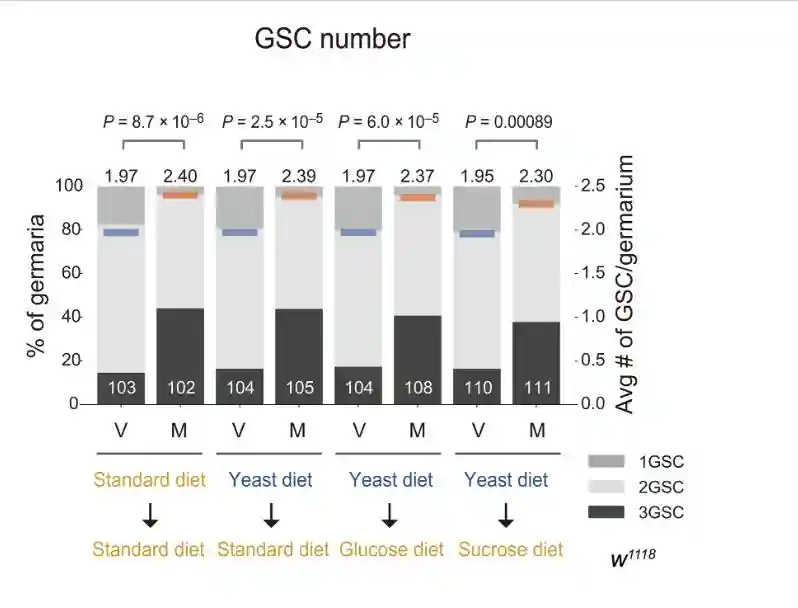 在编码糖味受体的Gr64a的RNAi的情况下,雌性的GSC数量异常高。编码三种糖味受体Gr5a,Gr43a和Gr64f的基因RNAi损害了交配诱导的GSC增加。Gr5a和Gr43a分别是用于感测海藻糖和果糖的味觉受体,而Gr64f可以感测多种糖,包括葡萄糖和蔗糖。