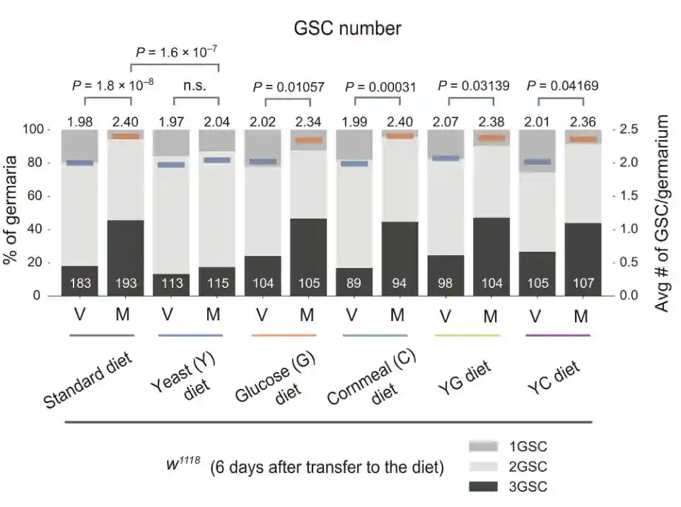 为了研究营养状况对交配诱导的GSC增加的影响,首先比较不同营养成分的苍蝇喂养日粮中交配前后的GSC数量。
