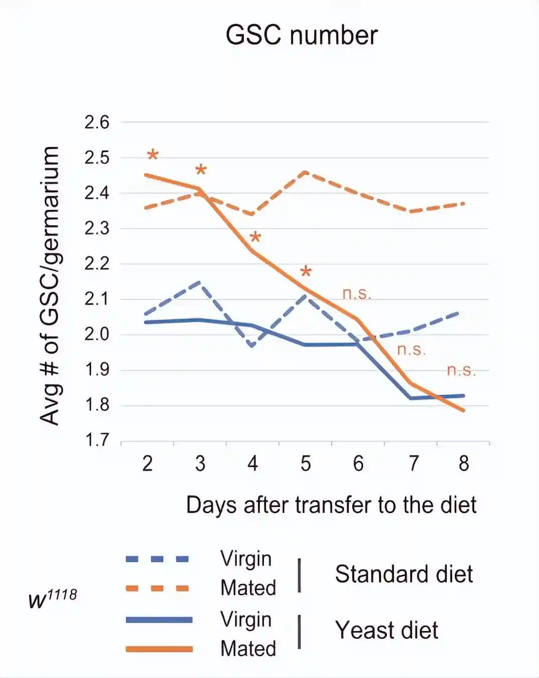 在标准饮食中,在任何检查的时间点观察到交配诱导的GSC增加。相反,在酵母饮食中,在转移后的前5天而不是6天内观察到交配诱导的GSC增加。