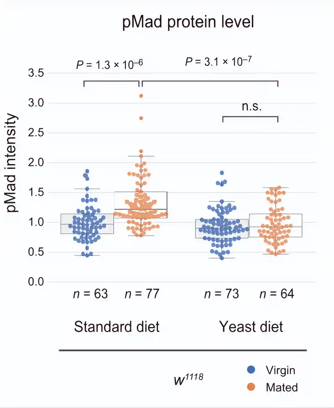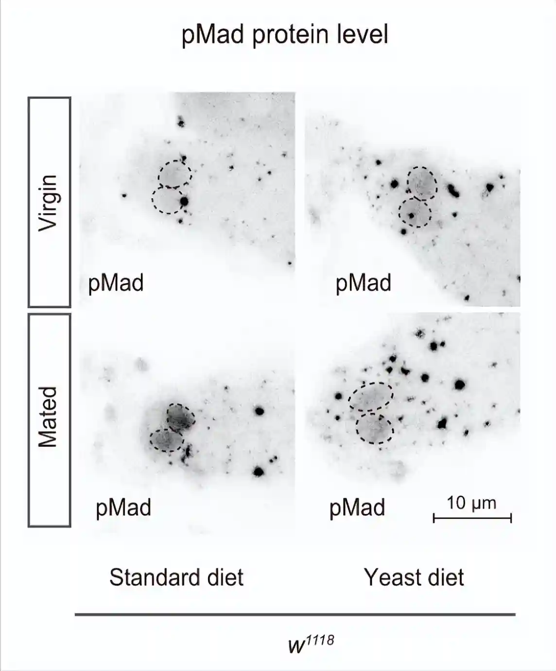 酵母饮食抑制了交配诱导的pMad升高,而标准饮食和酵母饮食中雌性GSC的pMad水平保持不变。这些结果表明,交配诱导的果蝇在酵母饮食中的GSC增加的损害是由于交配诱导的GSC中pMad升高的损害。