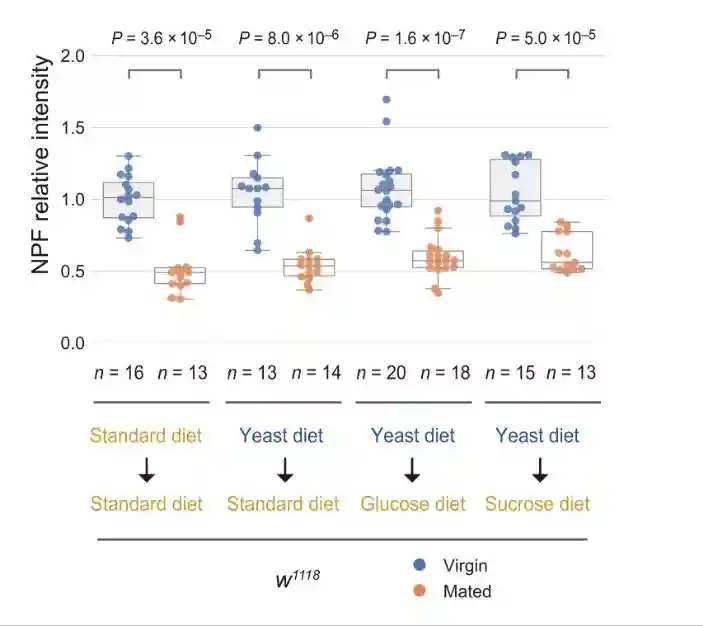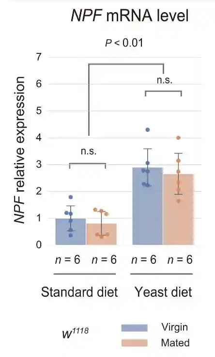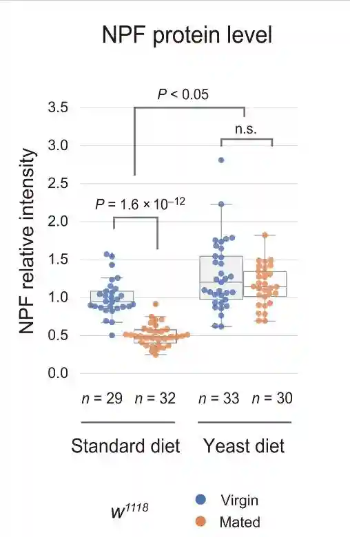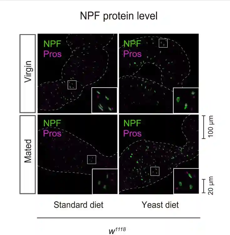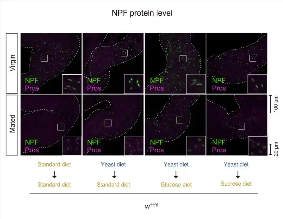 在酵母饮食中,雌性和交配雌性之间的NPF蛋白水平没有变化。在酵母饮食中,虽然雌性和交配雌性的NPFmRNA水平都增加,但交配并没有诱导肠道中NPFmRNA水平的增加。这些结果表明,即使在交配后,中肠EEC的NPF释放也被酵母饮食抑制。