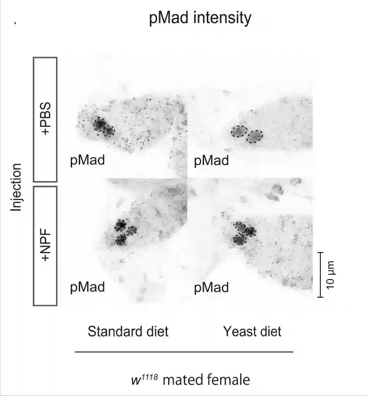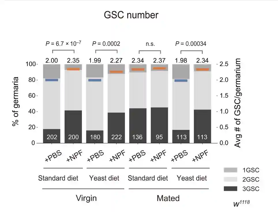 通过使用玻璃针将合成NPF肽注射到成年雌性中来手动递送,与向雌性注射磷酸盐缓冲盐水相比,在标准饮食中向野生型雌性注射NPF导致GSC数量增加。将NPF注射到酵母饮食中的野生型雌性中也诱导了GSC数量的增加,无论它们是雄性还是交配的雌性。