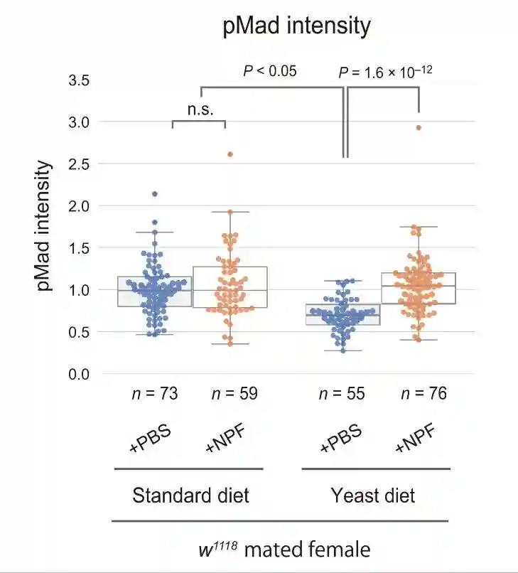 NPF注射诱导的GSC增加与雌性和交配雌性GSC的pMad强度升高密切相关。TKg-GAL4介导的NPF在NPFEEC中的过表达并没有完全恢复交配诱导的GSC增加对酵母饮食的失败,表明NPF释放由酵母饮食控制。