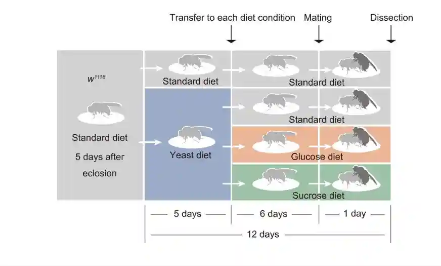用标准和酵母饮食饲养野生型苍蝇,将这些苍蝇转移到标准饮食,酵母饮食或含有蔗糖和琼脂的饮食,在转移后进行5天的培养期。允许其中一些苍蝇与雄配1天,其他雌性苍蝇在没有雄性的情况下连续饲养1天。