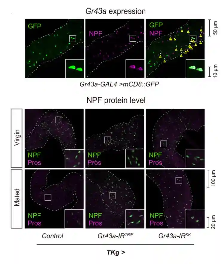 为了阐明交配后糖响应NPF释放的机制,专注于负责糖检测的Grs。在哺乳动物中,存在于EEC中的一些Grs接受营养并调节肠内分泌激素释放响应营养。在黑腹果蝇中,一些Gr基因在NPFEEC中表达,尽管它们在EEC中的功能尚未确定。进行转基因RNAi实验,以检查EEC中的哪种Gr参与交配诱导的GSC增加。