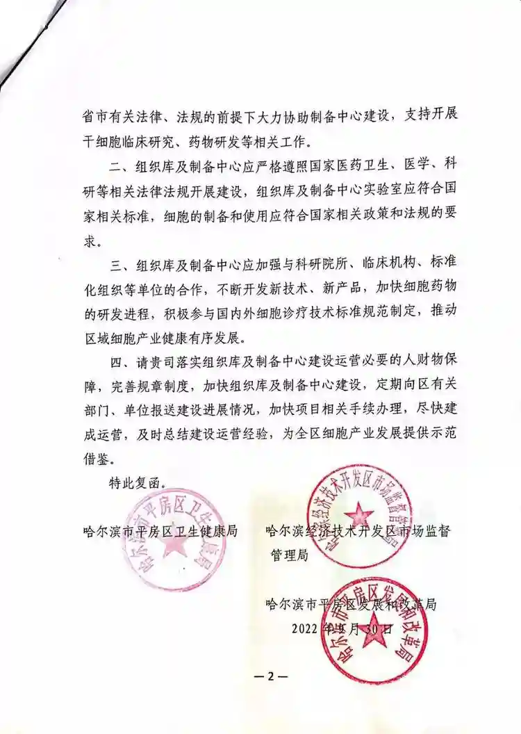 对哈尔滨市平房区的营商环境该公司相关负责人也打出了高分。她向记者展示了由哈尔滨市平房区卫生健康局、哈尔滨经济技术开发区市场监督局、哈尔滨市平房区发展和改革局联合发放的《关于支持鸿天九州干细胞医学(黑龙江)有限公司建设细胞组织库及细胞制备中心的复函》,她称,“区里的办事效率太高了,一个下午我们就拿到了三个部门共同盖公章的复函,心里特别温暖。也特别感谢平房区工商联为我们牵线搭桥,不仅让我们享受政策、快速落地,且用心用情用力服务企业,实验室建成前帮我们找了临时办公室,为发展干细胞产业增添动力与信心。”