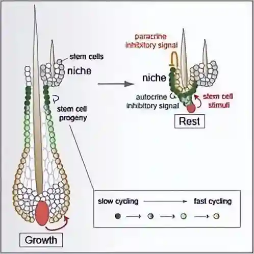 毛囊干细胞是头发毛囊中的“长寿细胞”,在人的一生中都会持续存在并分化。但是大量研究发现,脱发人群脱发并非没有毛囊干细胞,而是脱发区域内的毛囊干细胞进入了“休眠”模式,不再继续工作,需要靠特定的生长因子去刺激才能令其再次进入新的生长阶段。