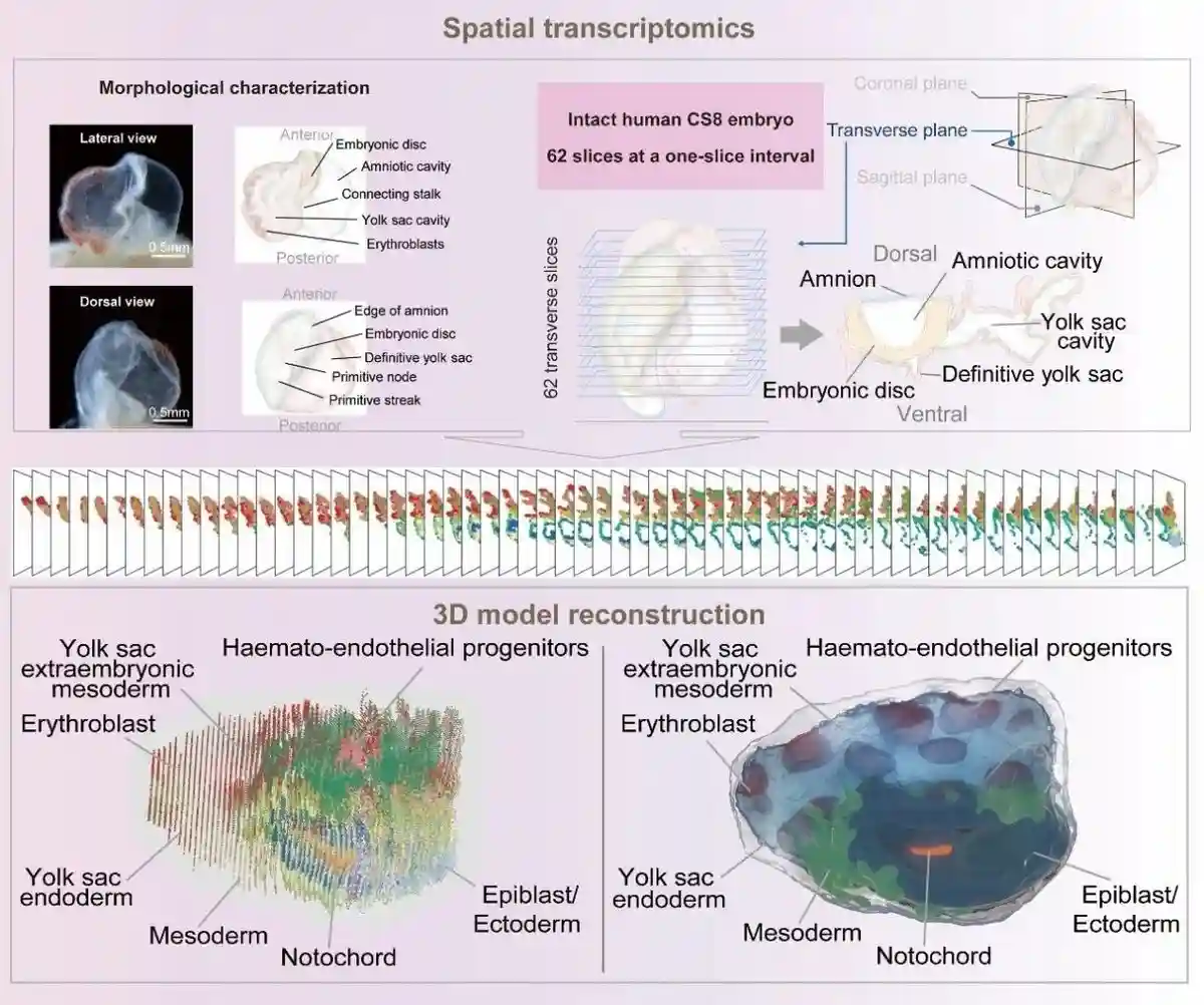 本研究基于一枚珍贵的CS8时期完整人类胚胎,利用连续横断面(transverseplane)高分辨空间转录组切片,结合机器学习算法进行三维对齐,构建了完整胚胎中不同细胞类型与基因表达的三维空间分布点云图,进而数字3D重构了首个完整人类原肠胚模型。