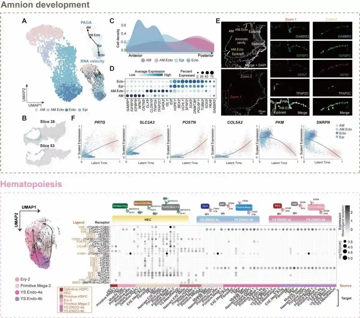 同属于灵长类,猴的原肠胚阶段关键发育事件和发生机制在生理特征及胚胎发育方面与人类高度类似。在我国科学家季维智院士团队、王红梅研究员团队以及彭广敦研究员团队还有多家国外研究团队共同努力下,猴原肠胚阶段重要科学难题正逐渐被系统解析,为研究人类原肠胚发育阶段关键科学事件提供重要参考。然而,若想了解人类原肠胚形成机制,需回归人胚胎本身。本研究系统描绘了胚胎形态、细胞类群、空间位置和转录组特征,解析重要胚外组织羊膜细胞发育过程和卵黄囊造血谱系特化。