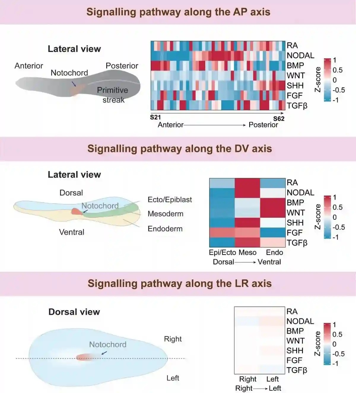 同时针对原肠胚前-后、背-腹、左-右体轴关键信号通路进行解析,提出胚胎尾部可能存在新的信号源和“组织者(organizer)”,为窥探人类极早期胚胎发育提供了重要窗口。