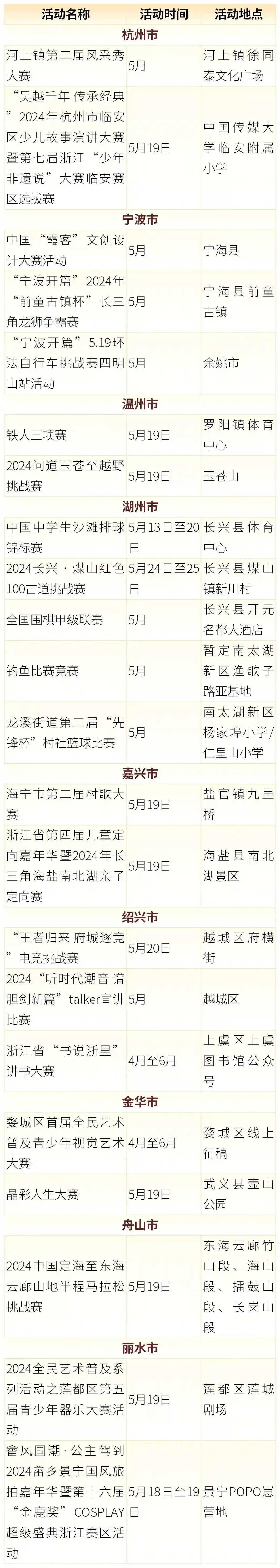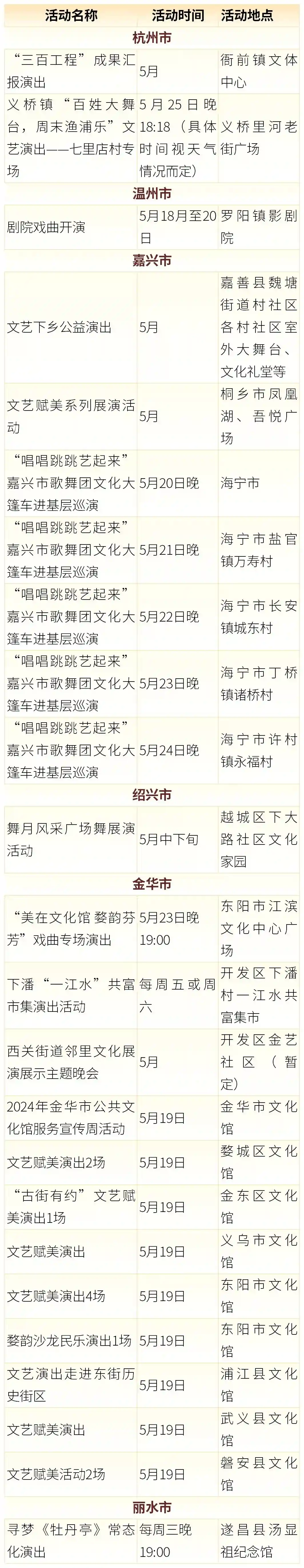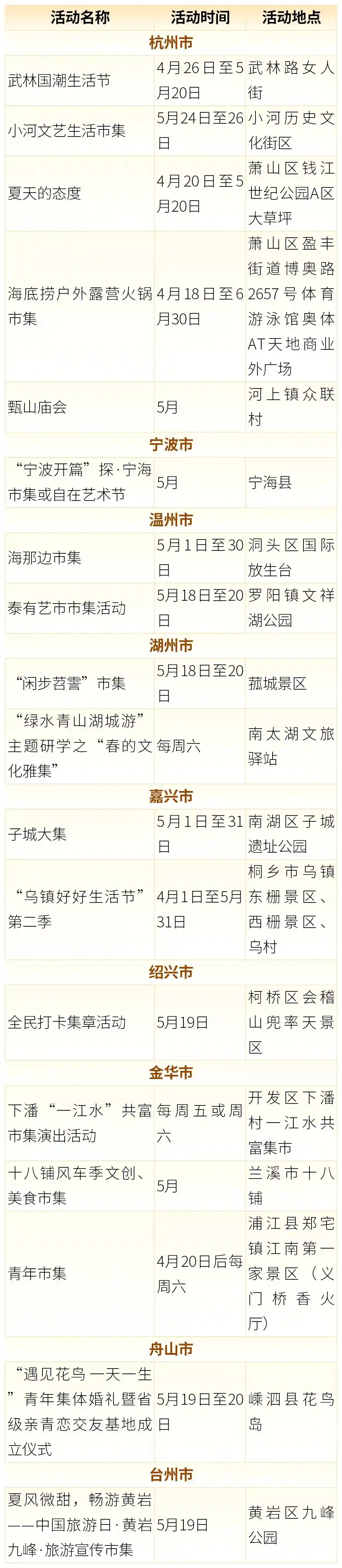 20.杭州东方文化园景区5月1日至6月10日主要活动:中国神话人物巡游,多个场地快闪演绎,美食展,儿童游乐;活动优惠:线上平台推出早鸟票价29.9元-49.9元,线下门票价格从128元/人优惠至80元/人