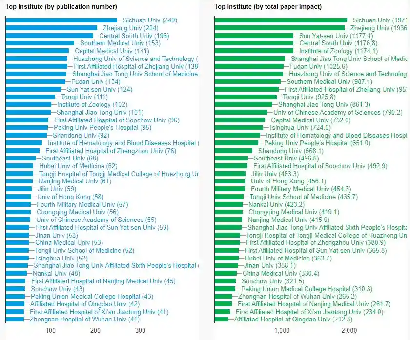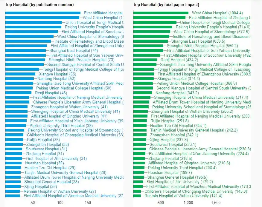 中国干细胞研究活跃的医院:中国浙江大学附属第一医院以发表干细胞相关研究论文137篇,位居近年来发文数量第一的医院;四川大学附属华西医院135篇、华中科技大学同济医学院附属协和医院103篇、北京大学人民医院102篇、苏州大学附属第一医院96篇、四川大学华西口腔医院88篇等都是发表论文较多的医院。而四川大学附属华西医院是发文影响力最大的医院。