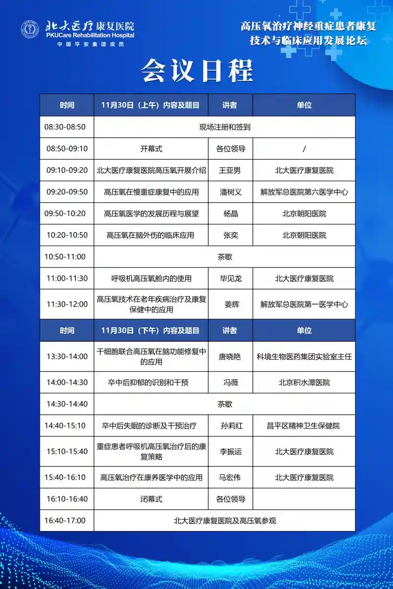 北大医疗康复医院诚挚邀请高压氧康复领域从业人员及相关专业人员;高压氧科、康复医学科、重症医学科、呼吸科、神经外科、神经内科等相关学科专业人员的医生、护士、康复治疗师等前来参会。