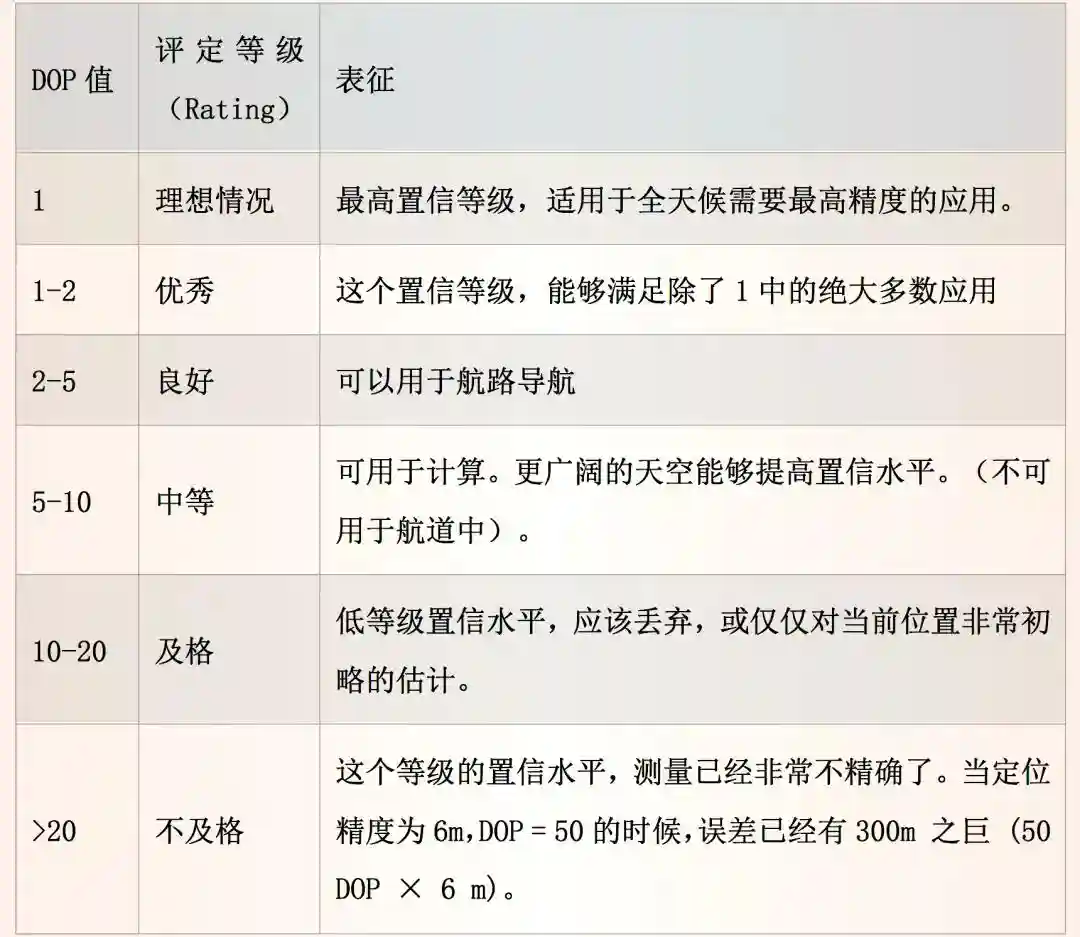 DOP越小定位精度越高,民用导航中仅使用水平精度因子(HDOP)和垂直精度因子(VDOP)已经满足要求,对于航海而言,船舶始终在海平面行驶,垂直高度已经用地理坐标系修订,所以只需考虑水平精度因子(HDOP)这一项,下表给出了它的表征值。
