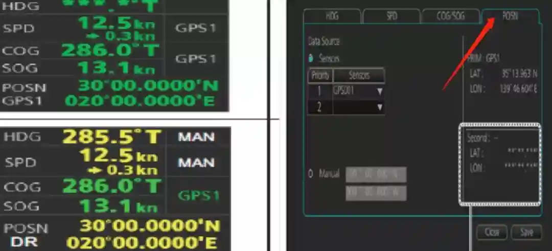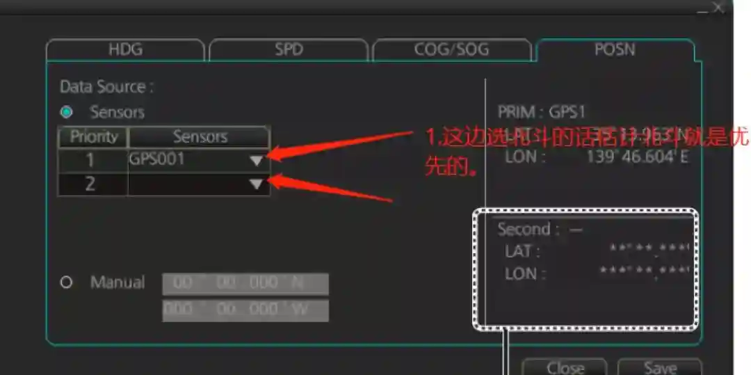 直接由GPS1和GPS2输出(不通过选择开关和放大器)接入两路信号,在MAIN-SETTING-SENSOR选择使用。在这种情况下,卫星船位可通过手动选择,如选择GPS还是北斗。