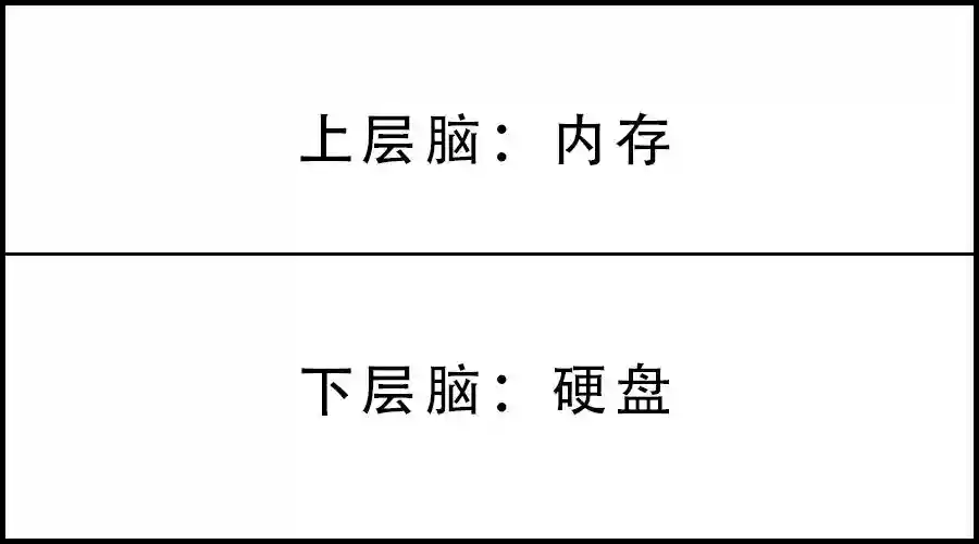 前额叶就是思考的工作区域,处理的是当前记忆的部分。在经过学习、训练之后,那些熟悉的记忆、固定的动作、下意识行为统存储在小脑、脑干等原始区域,便形成了潜意识或长期记忆。类比一下电脑,上层脑(主要是前额叶)相当于内存,下层脑相当于硬盘。