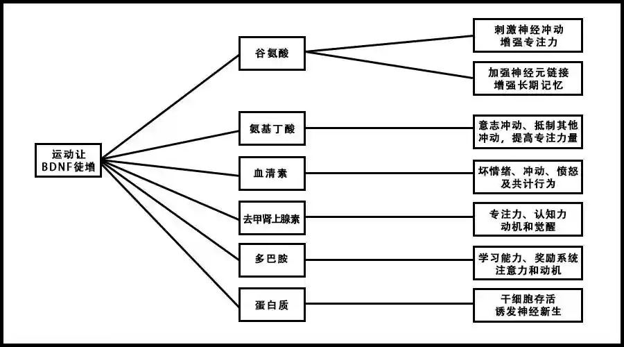 运动刺激BDNF的产生,BDNF在三个方面又影响了学习、记忆和专注力:BDNF能刺激长时增强效应,这是学习的重要环节;BDNF也能刺激谷氨酸盐和蛋白质的产生,巩固了神经回路的联结,增强了长期记忆功能;BDNF还能够帮助神经新生。