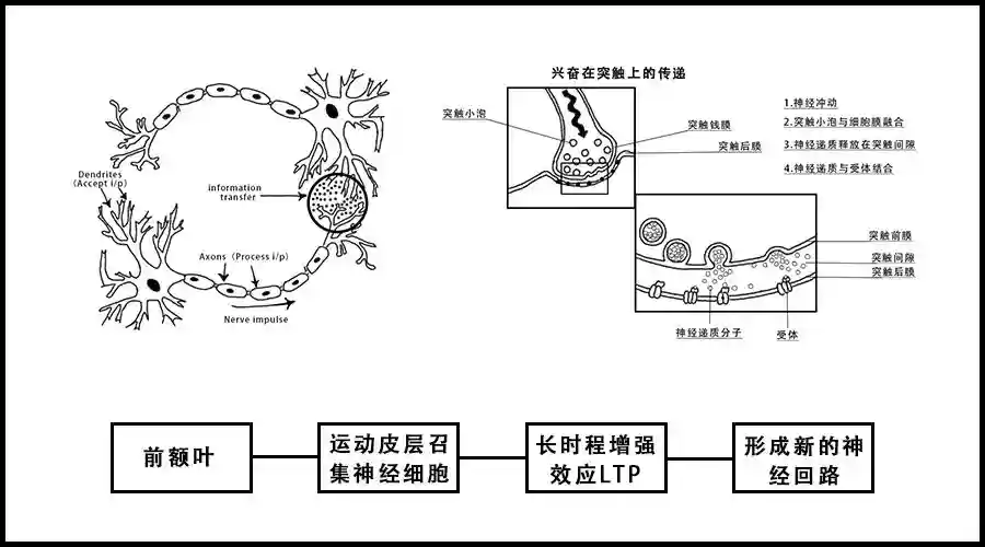 当我们学习一个新单词时,很多神经细胞被前额叶召集起来,相互之间通过神经递质传递着一个神经冲动信号(电流信号)以形成一个新神经回路。这个神经回路就是我们平时所说的神经元连接。神经元并不是真正联系在一起,它是两个神经元通过突触把神经递质传递给下一个神经元,与那里的特异性受体结合,由此打开了神经元细胞膜上的通道。通道建立之后,神经递质就把携带的电流信号传导出去。