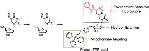 他们将5-甲酰基-2'-脱氧尿苷中糖的5'-OH被叠氮基(N3)取代,而叠氮基可以与炔基修饰的目标基团发生反应,进一步实现细胞或细胞器的选择性结合。同时,5fU中的醛基可与不同的化学物质结合,产生对各种环境敏感的荧光核苷碱基,从而检测特定目标。