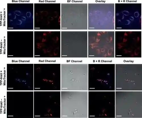为了验证这种概念的可行性,研究人员选择三苯基膦(TPP)作为靶向线粒体的基团,对癌细胞和小鼠胚胎干细胞中的线粒体进行选择性成像。结果表明,无论是在HeLa细胞中,还是在mESC中,TPP-biaU(蓝色)的信号与线粒体探针MitoTracker(红色)的信号均能很好地重叠。