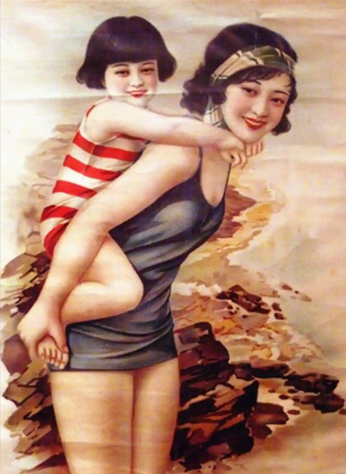 六、民国女性穿衣大解放由于政府的推动,社会思潮的变化,民国中后期,女性的衣着得以大解放,女性渐渐不再束胸,而且公开穿短袖、短裙、旗袍,甚至泳衣、乳罩。1930年代红极一时的影星阮玲玉,或许是第一个身体力行穿“义乳”的公众人物。“义乳”可以突显女性身体曲线之美,将胸部挺起。戴上“义乳”的阮玲玉,丰胸、细腰,与旗袍的剪裁样式天衣无缝。与此同时,达官显贵家的太太、子女也在追求时尚,突破穿衣禁忌。1930年,民国内务总长朱桂莘之女名媛洪筠,穿着西式泳装在北戴河游泳。这一举动成为当时备受争议的事件。