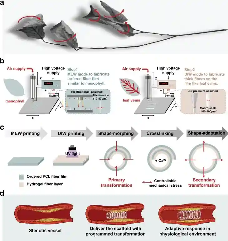 为了解决这一问题,王华楠团队根据自然界中许多枯萎的叶子或花朵在脱水后自发卷曲,从扁平结构转变为管状结构的现象中获得启发,开发了一种创新策略来设计刺激响应支架。该支架能够从扁平的2D结构可编程地转换为各种卷曲的3D组织模拟结构,并能够在体内进行二次转化以适应局部管状组织内的几何形状。