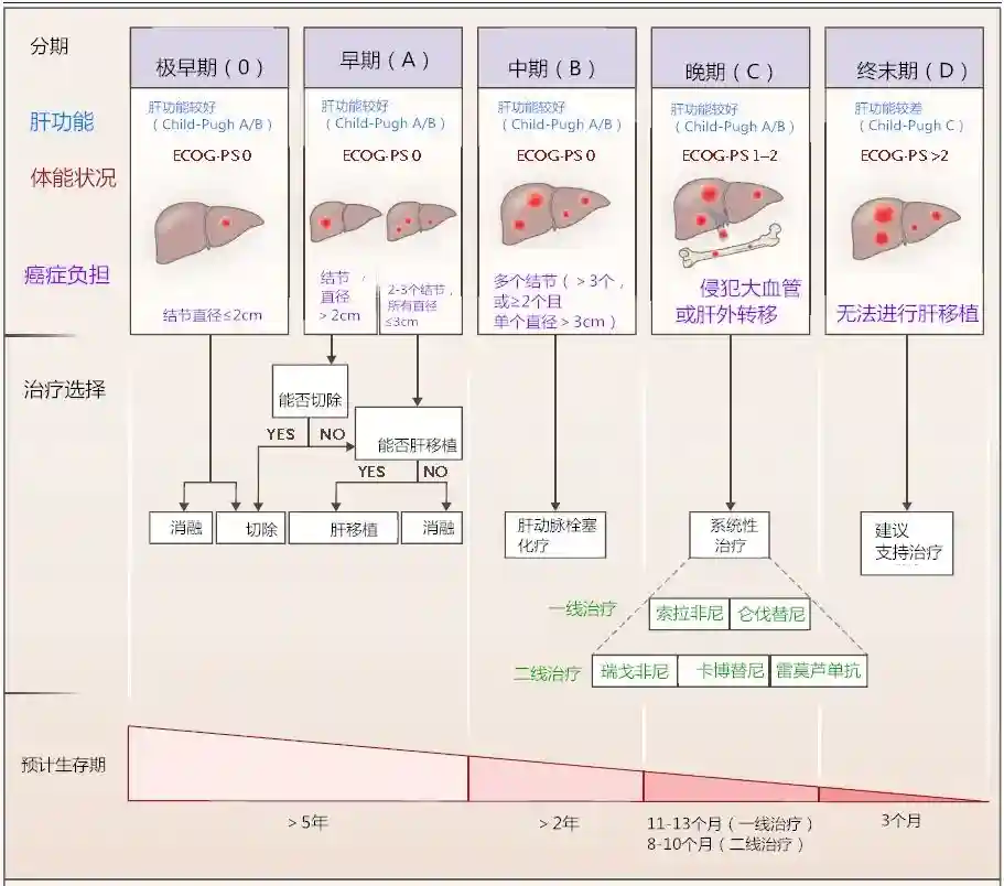 由于大多数HCC患者伴有肝脏疾病,肿瘤治疗必须权衡干预措施对肝硬化患者的潜在伤害。为了充分评估患者的预后,分期系统需要同时量化肿瘤负荷、肝功能不全的程度和体能状态。
