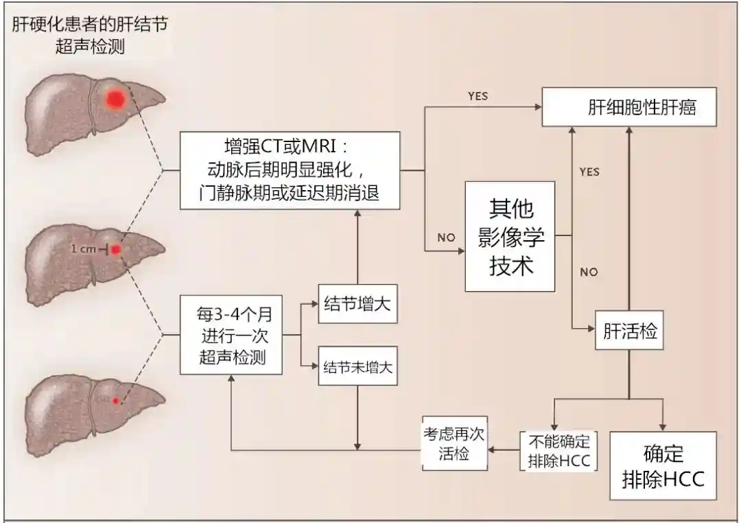 可以根据结节的大小和影像学表现来诊断肝硬化患者是否罹患HCC。如果结节直径<1cm且在12个月后未增大,则应考虑恢复到常规的6个月监测。美国肝病研究协会(AASLD)指南建议,对于不确定结节,可以采用影像学随访来替代活检。