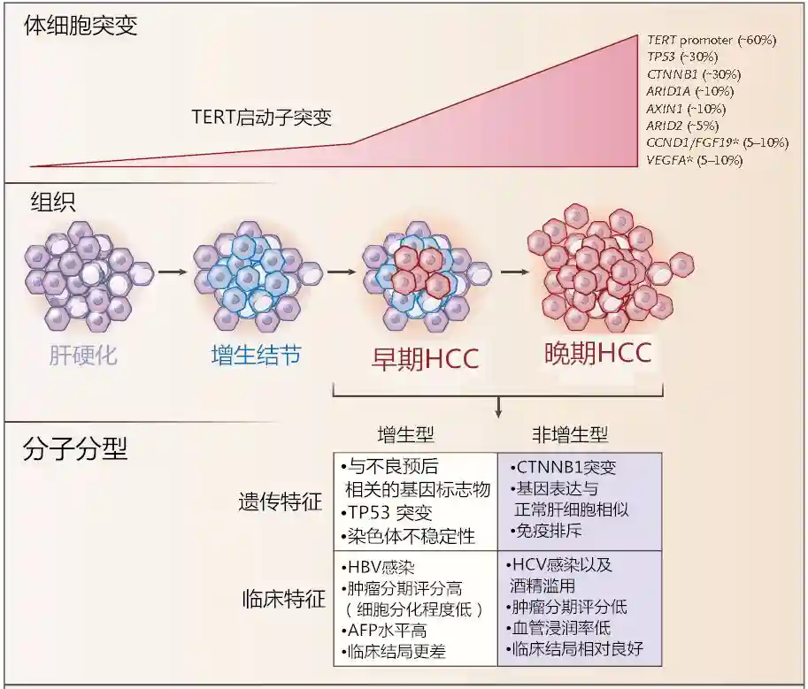 图中描述了人HCC发生过程中关键的分子和组织学改变,以及HCC两个分子亚型的主要遗传和临床特征。*表示高水平的DNA扩增。在非增生型中,CTNNB1突变增强了免疫排斥。