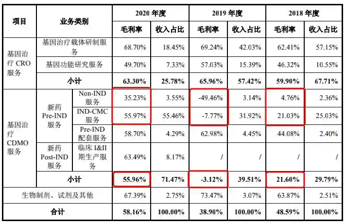 值得注意的是,基因疗法CDMO服务下新药Pre-IND服务的毛利率在2019年出现了负值。招股书显示,Non-IND服务、IND-CMC服务2019年的毛利率分别为-49.46%、-7.77%,2020年毛利率又出现了大幅增长。