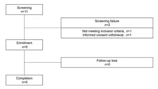 在筛选的11名RA患者中,1人不符合入组标准,1人放弃。最终有9人入组,被分为3个小组接受单次静脉输注脐带血间充质干细胞。