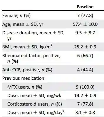 与类风湿关节炎的流行病学数据一致,受试者主要是女性(78%,男女比接近1:3),平均年龄为57.4岁,疾病平均持续时间为9.5年,基线DAS28平均评分为4.53分。