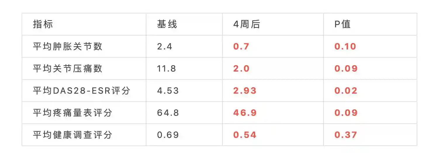 尽管疗效评估不是本次1a期研究的主要目的,但依然观察到了有积极意义的结果。在单次输注脐带血MSCs4周后,患者DAS28评分的降低具有统计学意义(-1.60±1.57mm/小时,p=0.0158)。