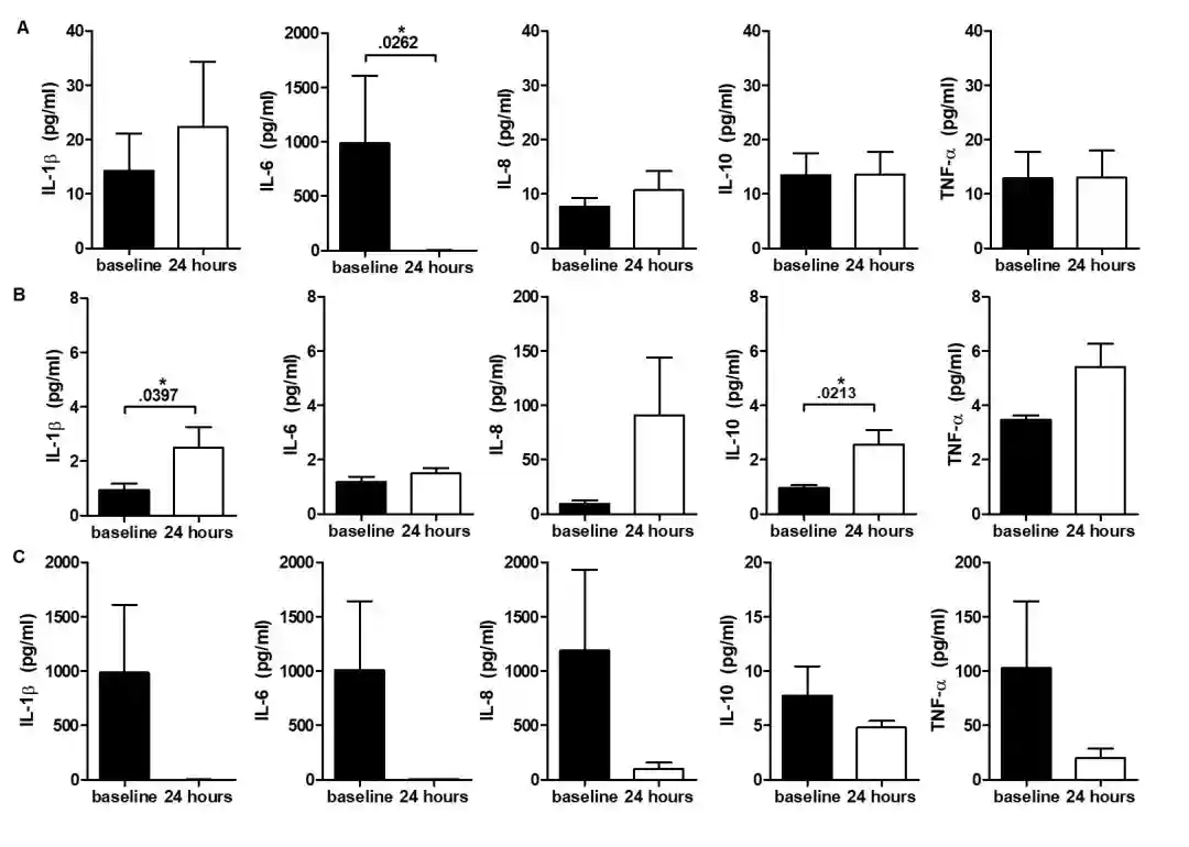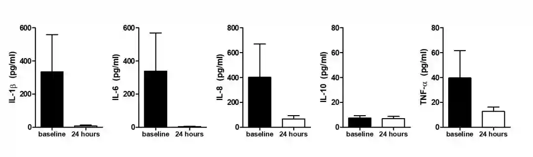 脐带血MSCs输注后基线及24小时血清IL-1β,IL-6,IL-8,IL-10和TNF-α水平