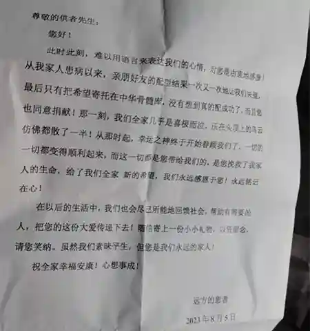 捐献造血干细胞当天,刘培宇收到了来自受助患者家属写来的感谢信。信中这样写道:从我家人患病以来,亲朋好友的配型结果一次又一次地让我们失望,最后只有把希望寄托在中华骨髓库,没有想到真的配成功了,而且你也同意捐献!从那时起,幸运之神终于开始眷顾我们了,是你挽救了我家人的生命,给了我们全家新的希望,我们永远感恩于你!永远铭记在心!