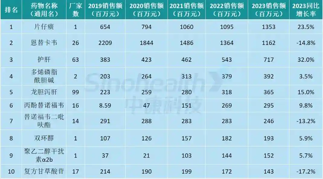 2023年全国零售终端肝病治疗药销售额TOP10