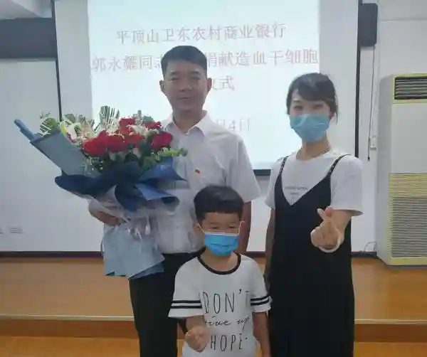 当日上午,平顶山卫东农村商业银行举行郭永耀赴郑捐献造血干细胞欢送仪式,用鲜花和掌声送他踏上爱心之旅。