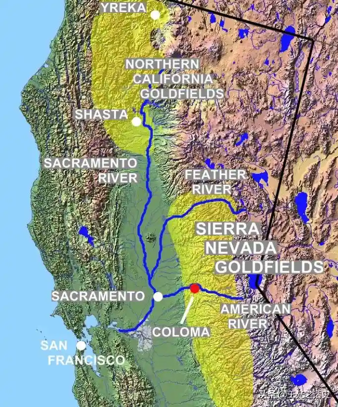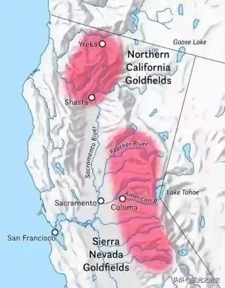 金色部分为加州的黄金产区,华人第一次大规模移民美国就是因为加州淘金热,有2万多华人移居加州