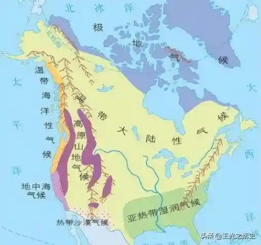 北美洲的气候简图。加利福尼亚北部为温带海洋气候,南部为地中海气候(夏季干燥炎热)