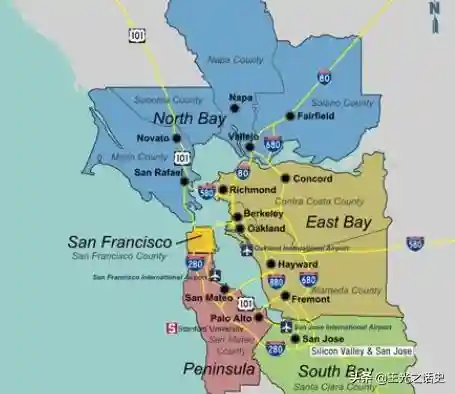 加州旧金山大湾区行政区划图,分为北、南、东三大块,硅谷位于南湾区