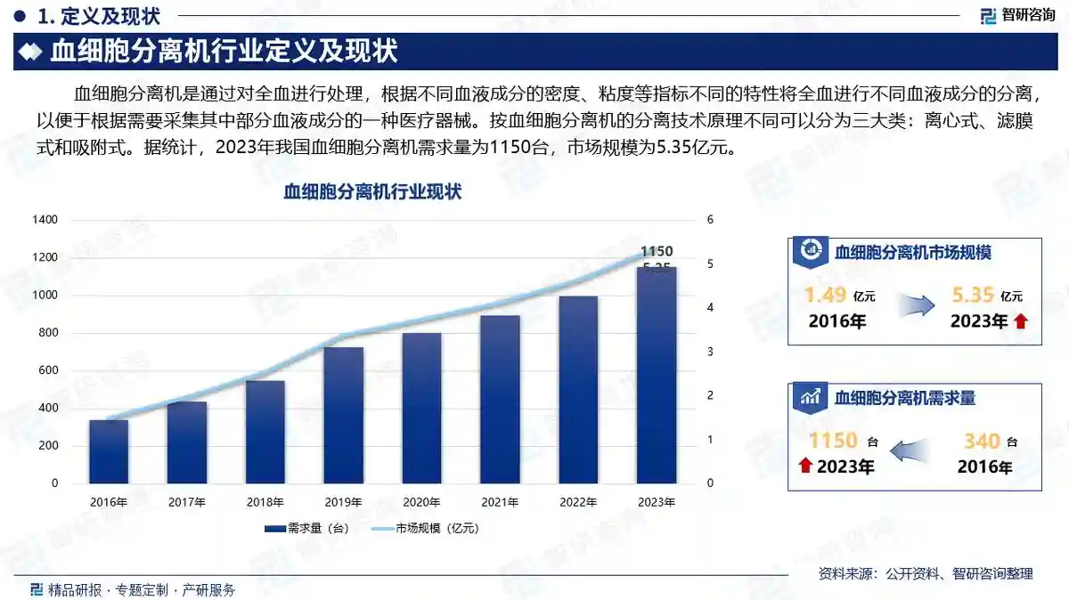 智研咨询组织编撰的《2024-2030年中国血细胞分离机行业市场现状调查及投资前景研判报告》(以下简称“《报告》”)是中国血细胞分离机领域的专业市场研究报告,是血细胞分离机行业发展忠实的记录者和见证者。旨在为中国血细胞分离机行业生产厂家、政府机构、业界专家了解和掌握中国血细胞分离机发展脉络提供全面参考。