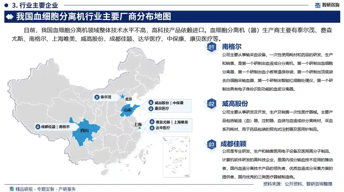其中南格尔主要从事输采血设备、一次性使用耗材和药品的研发、生产和销售,是第一个研制出血液成分分离机,第一个研制出血细胞分离器,第一个研制出血小板常温保存袋,第一个研制出顶底袋去白细胞采输血器,第一个研制出智能红细胞处理仪,第一个研制出具有电子身份识别功能的血浆分离器。威高股份主要从事研发及开发、生产及销售一次性医疗器械。主要产品包括输液(血)器、注射器、血袋与血液成份分离耗材、采血系列耗材、用于药品包装的预充式注射器及医用针制品。成都佳颖是专业研发、生产和销售医用电子设备及医用高分子制品、计算机软件研发的高科技企业,是国内成分输血技术应用的推动者,国内血液分离技术产品的领先者,优质血液成分采集方案的提供者,国内优秀的三类医疗器械制造商。