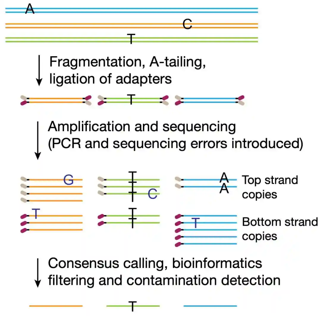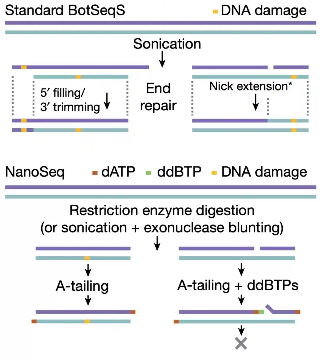 为了规避文库准备过程中由末端修复和缺口延伸引入的错误配对,NanoSeq使用限制性内切酶(而不是超声)打断DNA双链,这样产生的平末端无需末端修复。而对于双链中产生的缺口,NanoSeq会在缺口末端引入一个双脱氧核苷酸来终止缺口延伸。