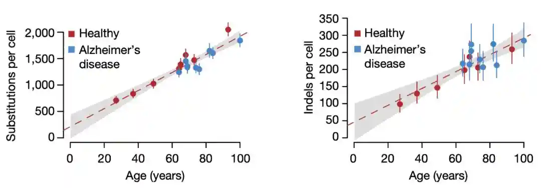 研究人员对来自健康人和AD患者的前皮层神经元测序后发现,其体细胞变异数量随年龄增长(点突变增长17.1个/每年,13.7-20.5;插入缺失突变增长2.5个/每年,1.7-3.3)。