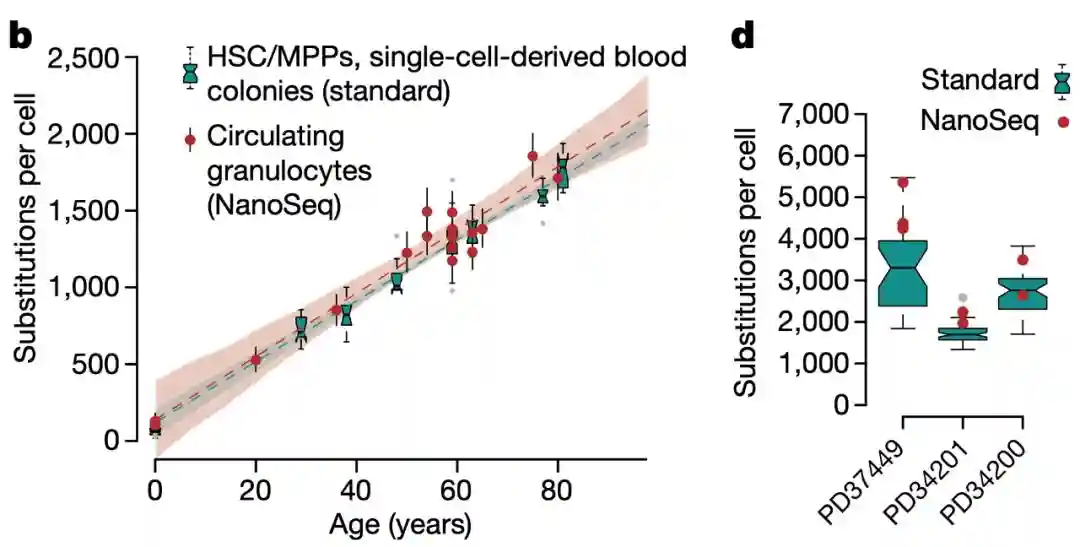 但研究人员在分别对造血干细胞和粒细胞,以及结肠干细胞和结肠上皮细胞测序后发现,干细胞的变异数量竟然和终末分化细胞在统计学上并没有显著差异。而且终末分化细胞中的大部分突变是在干细胞阶段积累的,只有少量突变发生在增殖和分化过程中。