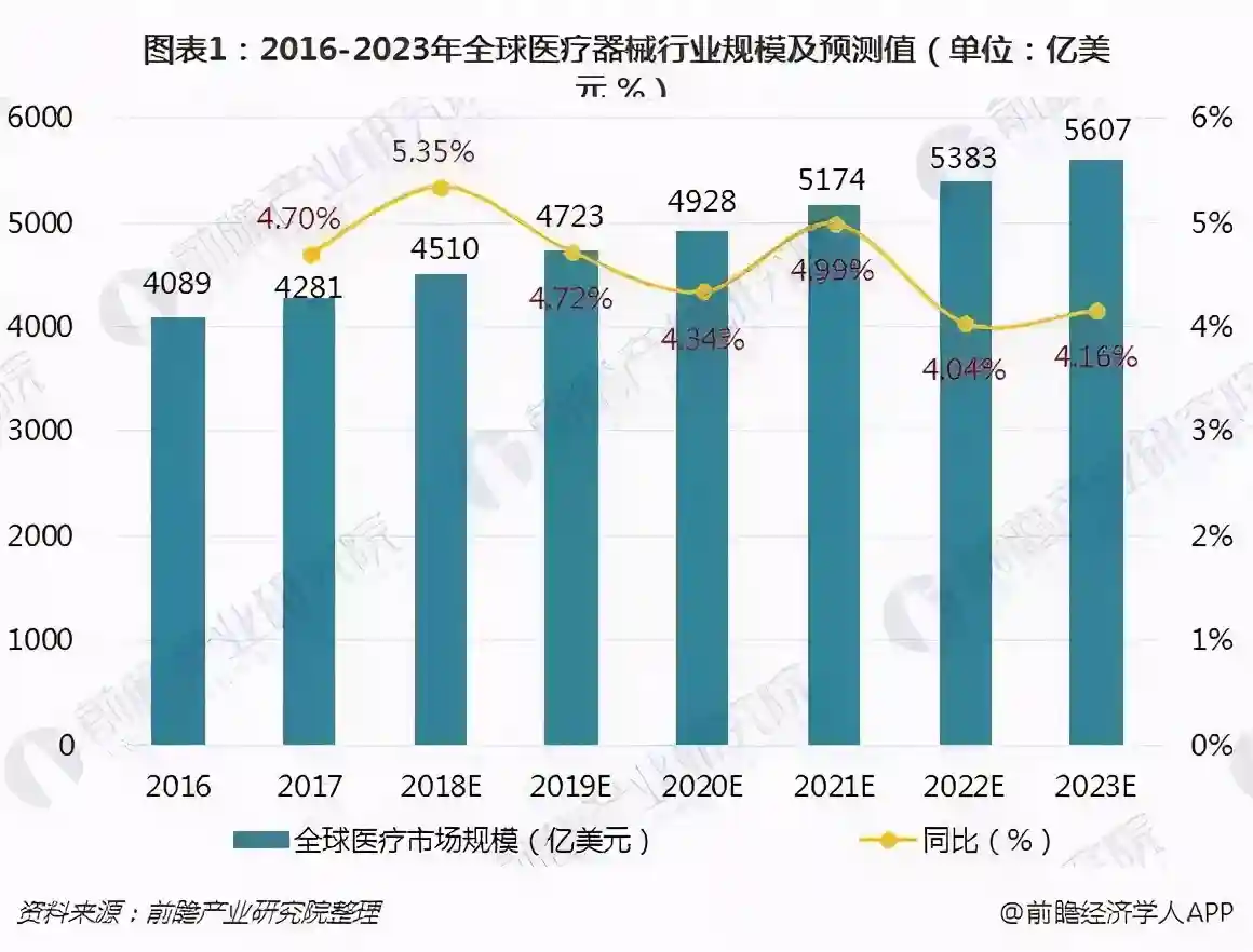图6:2016-2023年全球医疗器械行业规模及预测