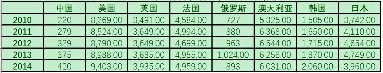 表6:2010年-2014年部分国家年人均卫生费用(美元)