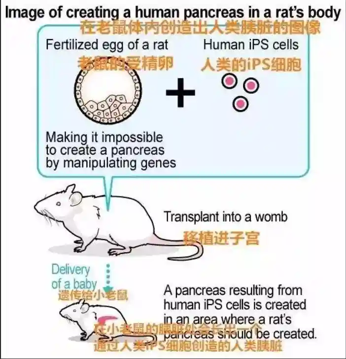 然而日本在近年却重启了这项实验,原因是他们改良了技术,并且实验发现技术可行。简单来说,日本科学家先将小白鼠体内的胰脏基因去除,而后等到小白鼠长大,再将其卵细胞与精子结合,产生不含胰脏基因的胚胎细胞,而后再把人类的胰脏基因移植进去。