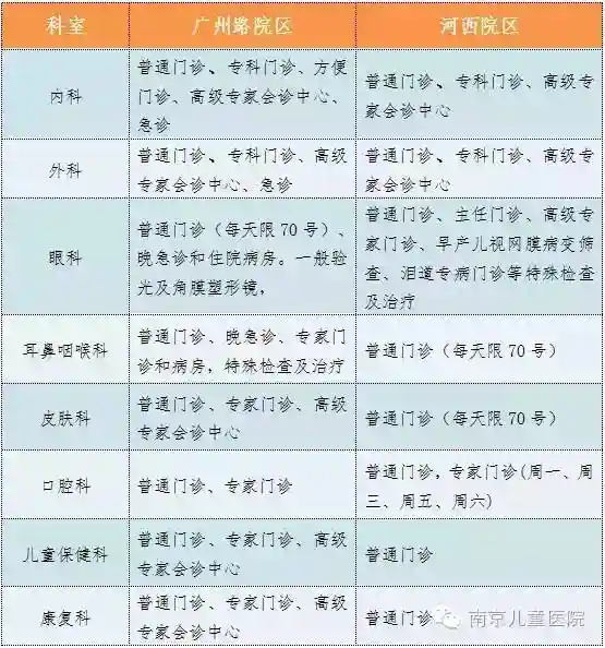 患儿可以在河西院区看到除急诊之外的所有门诊,具体包括:内外科普通门诊,内外科各专科门诊、眼科、耳鼻咽喉科、皮肤科、口腔科、儿童保健科、康复科等。同时开放的还有高级专家会诊中心和相关的辅助检查科室。